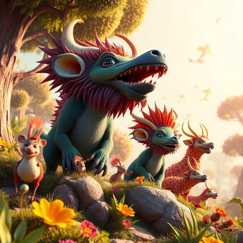 A vibrant scene of wild animals in a colorful, fantastical landscape. The image is rendered as 3D digital art, with bright colors and intricate shading, in a whimsical, concept art style.