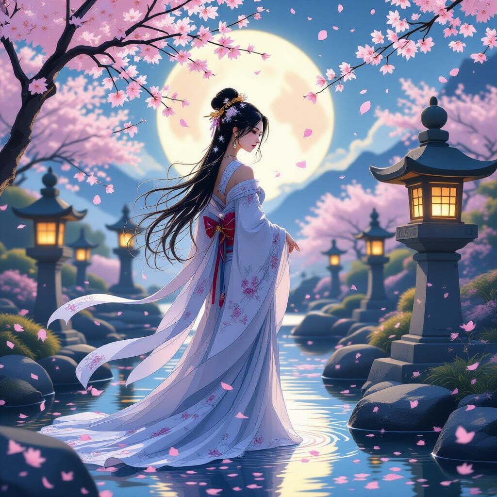 This image shows a goddess with luminous hair and robes in a tranquil Japanese garden at sunrise. Cherry blossoms fall around her, illuminated by stone lanterns, in a digital painting style with art nouveau fluidity.