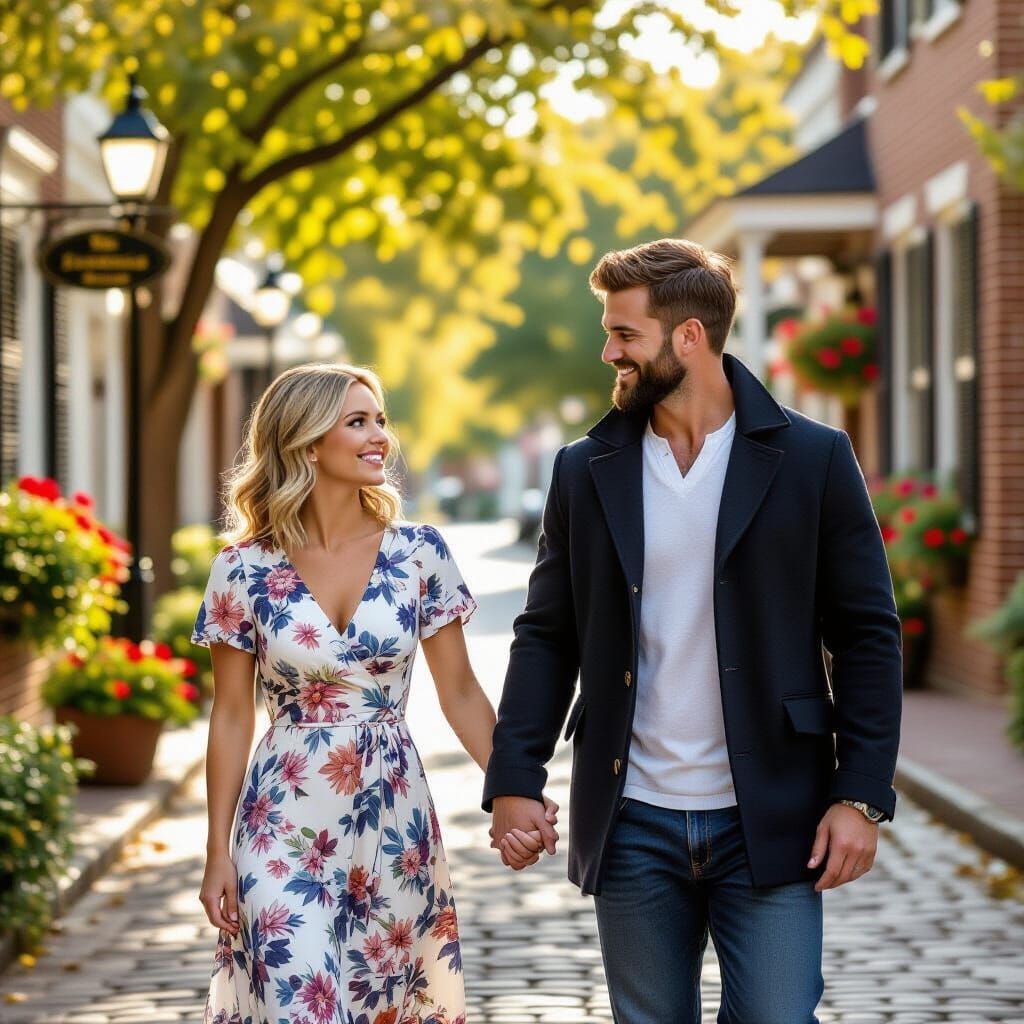 A sun-drenched cobblestone street in a quaint Southern town. A couple walks hand-in-hand under leafy trees, bathed in warm golden hour light. Photorealistic style.