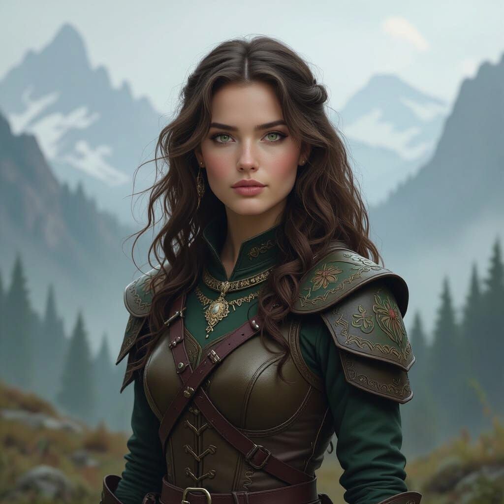A digital painting of a young Breton woman in Skyrim. She stands in a misty landscape of mountains and forests, wearing embroidered leather armor, rendered with realistic and fantastical elements.