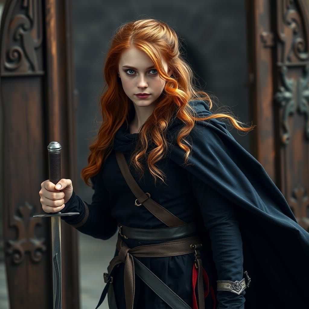 A striking picture of a slender young female warrior with long red hair, walking through a doorway with sword in hand. She wears medieval clothing and a cape, captured with studio lighting and sharp focus.