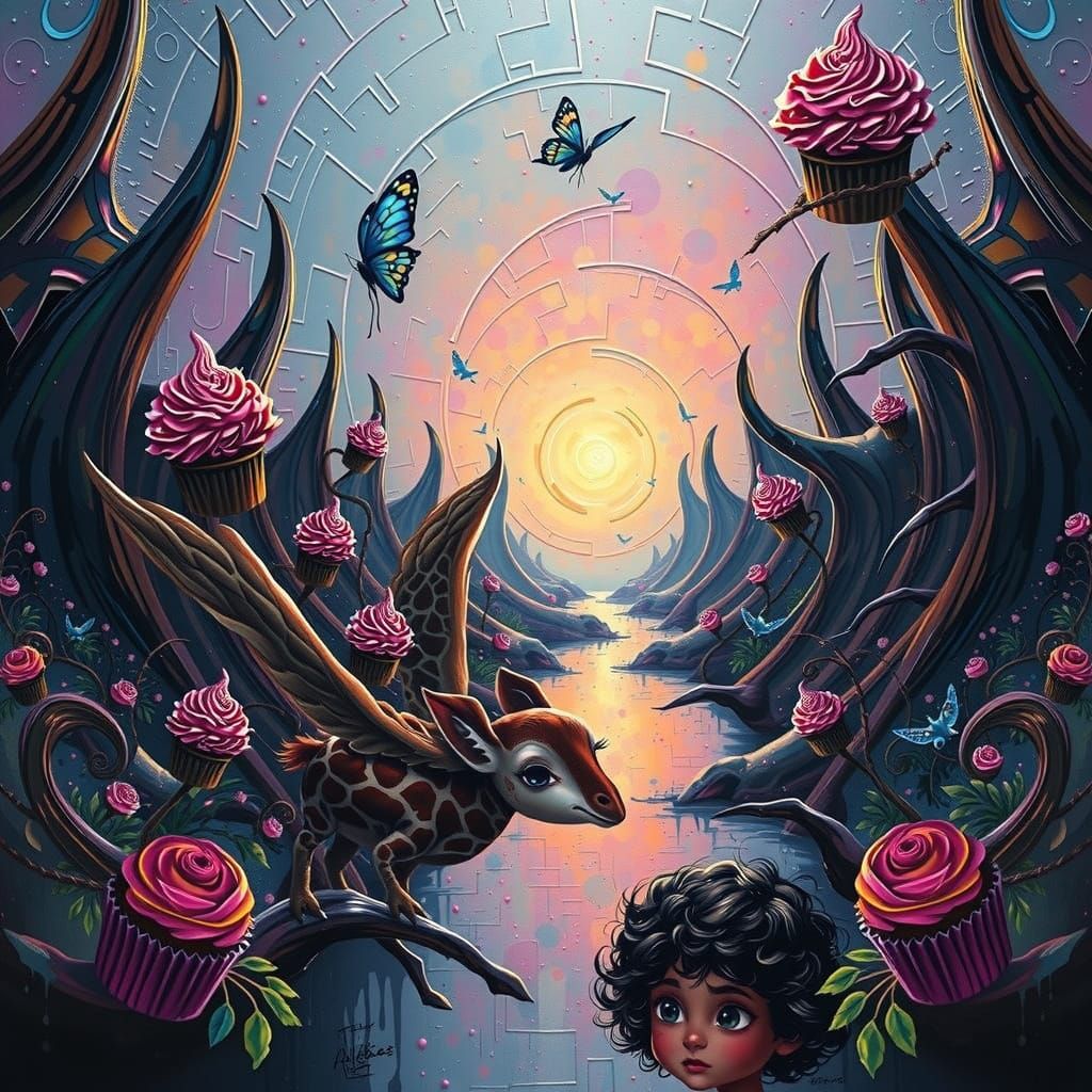 This image shows a tiny giraffe with wings carrying cupcakes near two children. The scene features an iridescent vortex tunnel background and is rendered with impasto textures and vibrant colors.