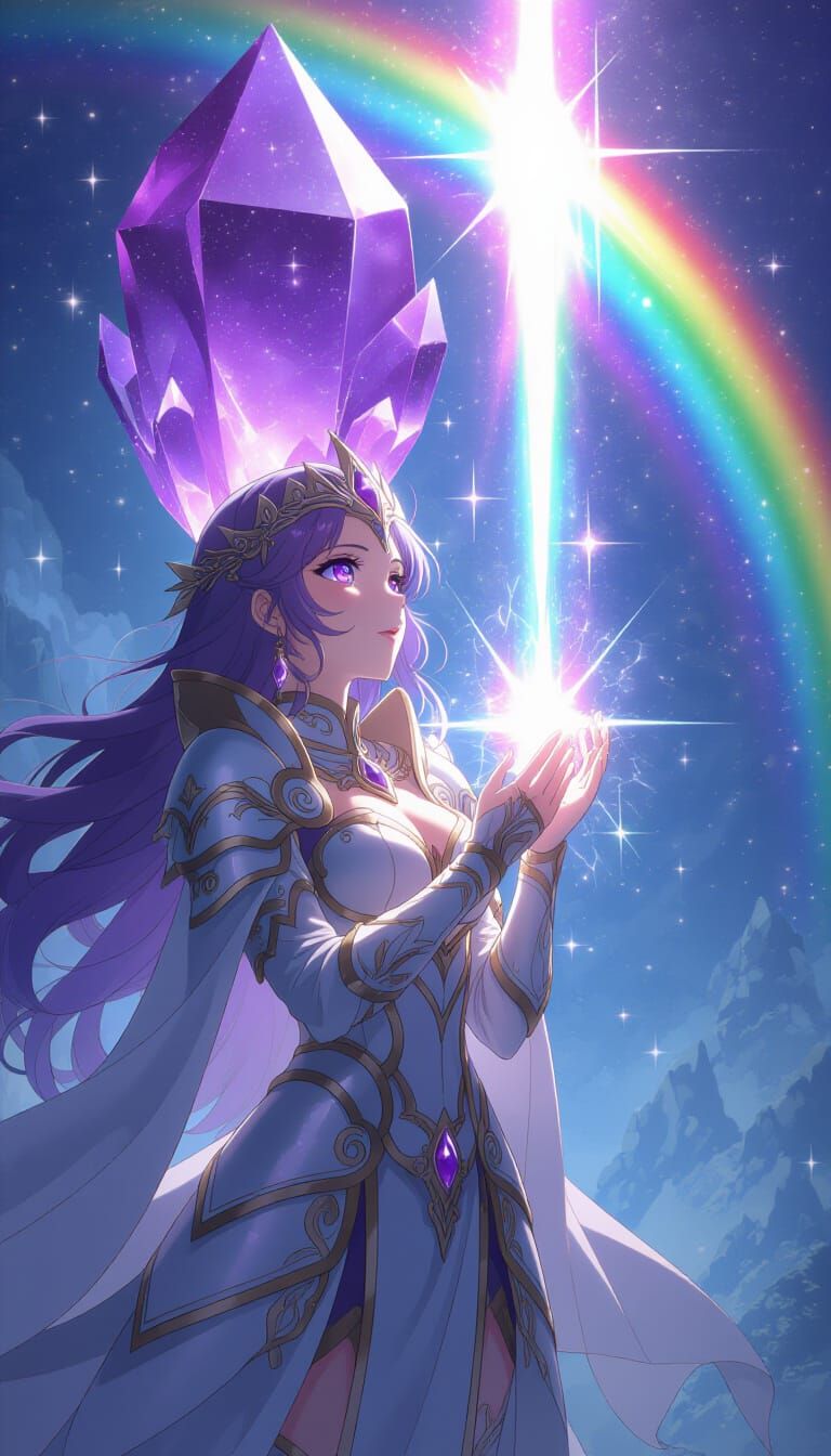 A digital anime illustration of a dragon woman in baroque armor looking up at a beam of light. The light refracts off an amethyst crystal into vibrant rainbow colors, creating a lush and detailed ambiance.