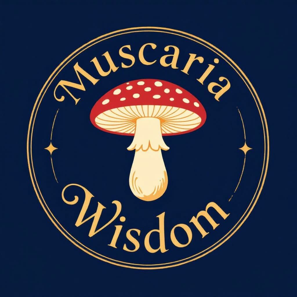 This image features a symmetrical, minimalist logo for Muscaria Wisdom. It showcases a stylized red and white mushroom with golden text and details on a deep blue background, embodying a mystical and refined aesthetic.