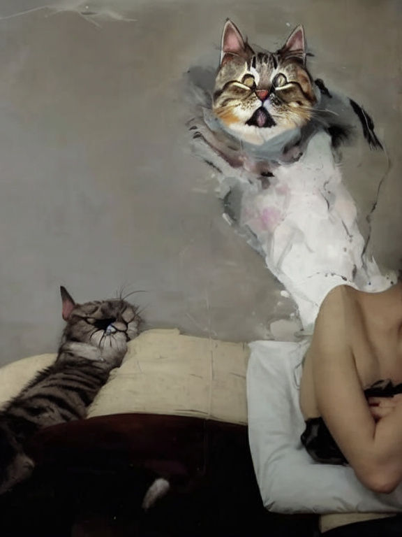 "inpaint remove the masked signature and repair bg & Obstinate Cat Sleeping on Mistresses Pillow "I'm Waiting Mercenary" Uses Ostrich Feather TO SHOO him away intricately detailed hyper-realistic mixed media ink painting by Lucian Freud Ismail Inceoglu Pino Daeni Kandinsky maximalism photorealism precisionism ambient occlusion VRay 16k masterpiece 3D shading ZBrush Central light dust photorealistic striking hyper real painting"