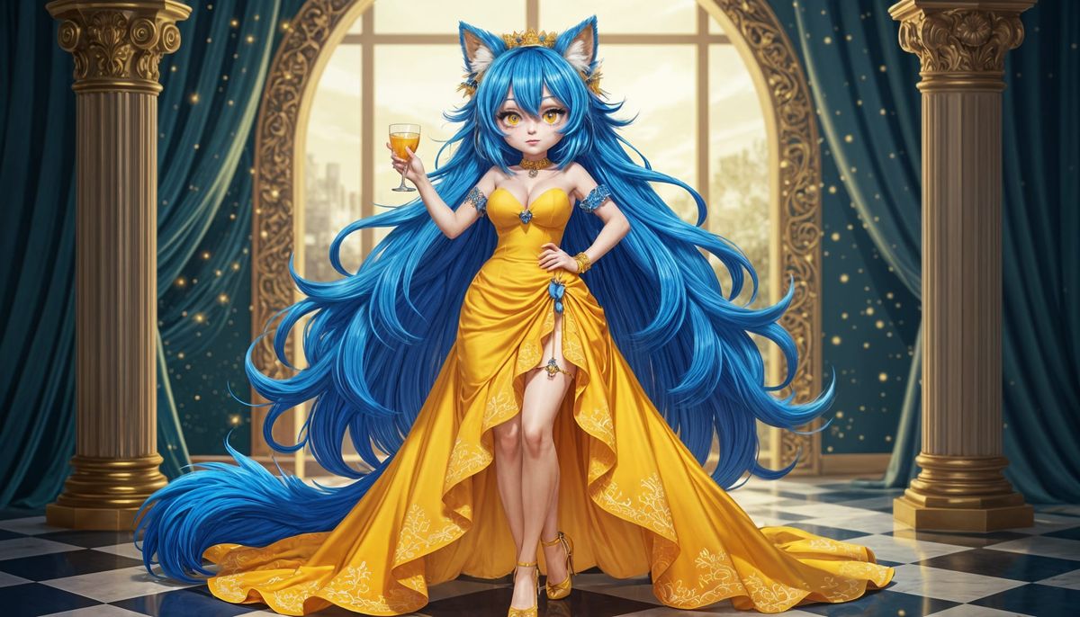 A striking picture of an anthropomorphic catgirl with blue fur and golden eyes. She wears a yellow evening gown with lace details and confidently holds a drink.