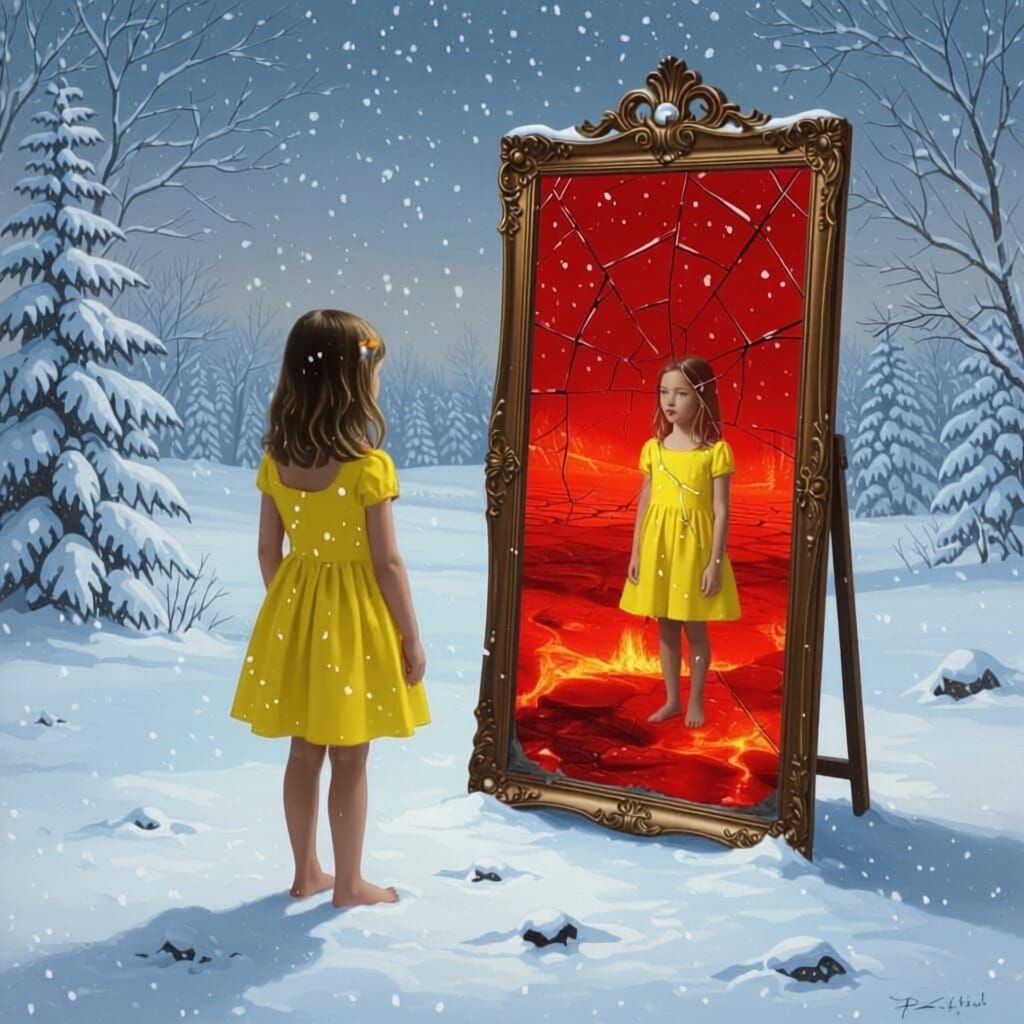 This image depicts a girl in a red dress facing a mirror that reflects a fiery, volcanic landscape, starkly contrasting with the snowy wonderland outside.