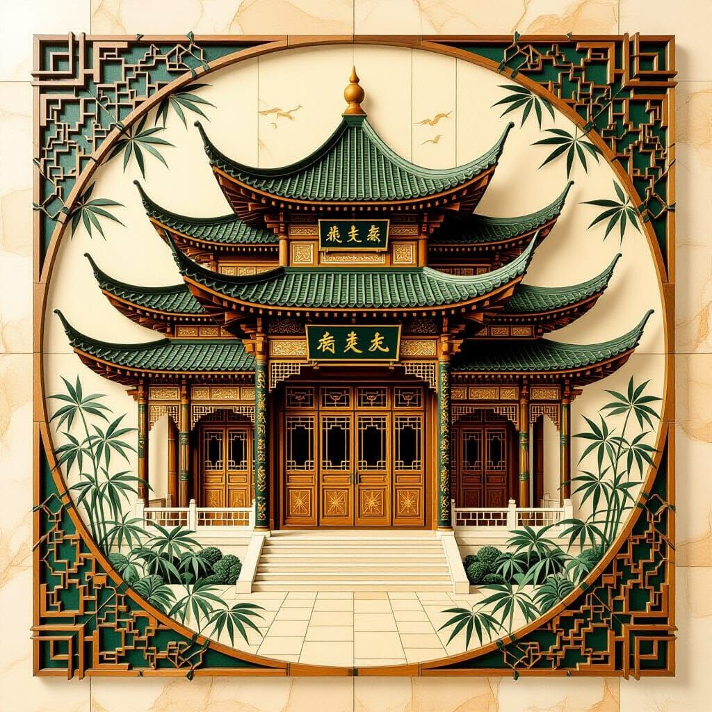 This image showcases a Chinese temple crafted with Art Deco marquetry, featuring detailed bamboo wood patterns. The design blends geometric lines with opulent embellishments and rich, sophisticated colors with gold accents.