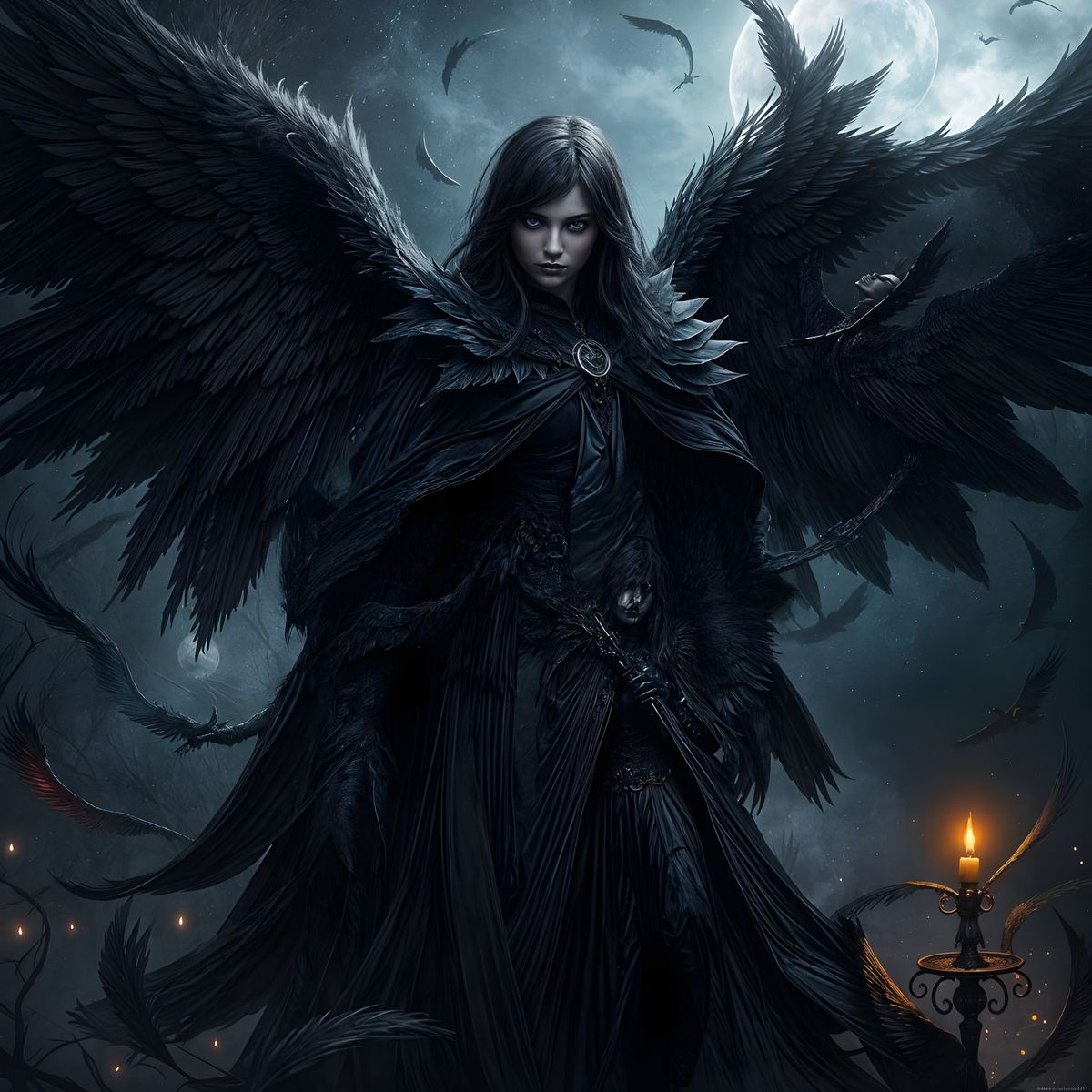 A striking picture of a dark angel with glowing eyes and a cloak of shadows. The color palette features deep blacks, reds, and purples, illuminated by candlelight and moonlight in an ethereal fantasy style.
