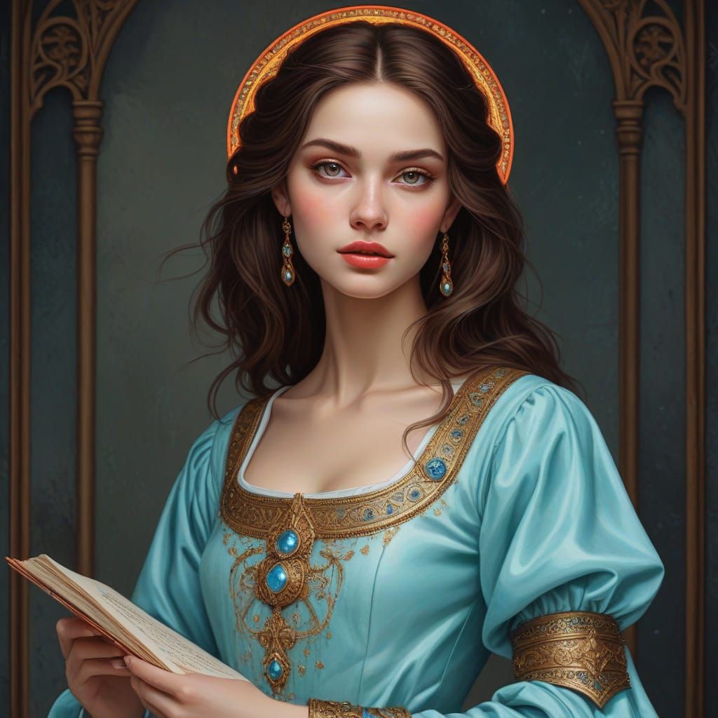 This image shows a medieval icon of a woman in neon colors. The artwork blends canvas textures and stardust effects, giving it a unique and modern aesthetic.