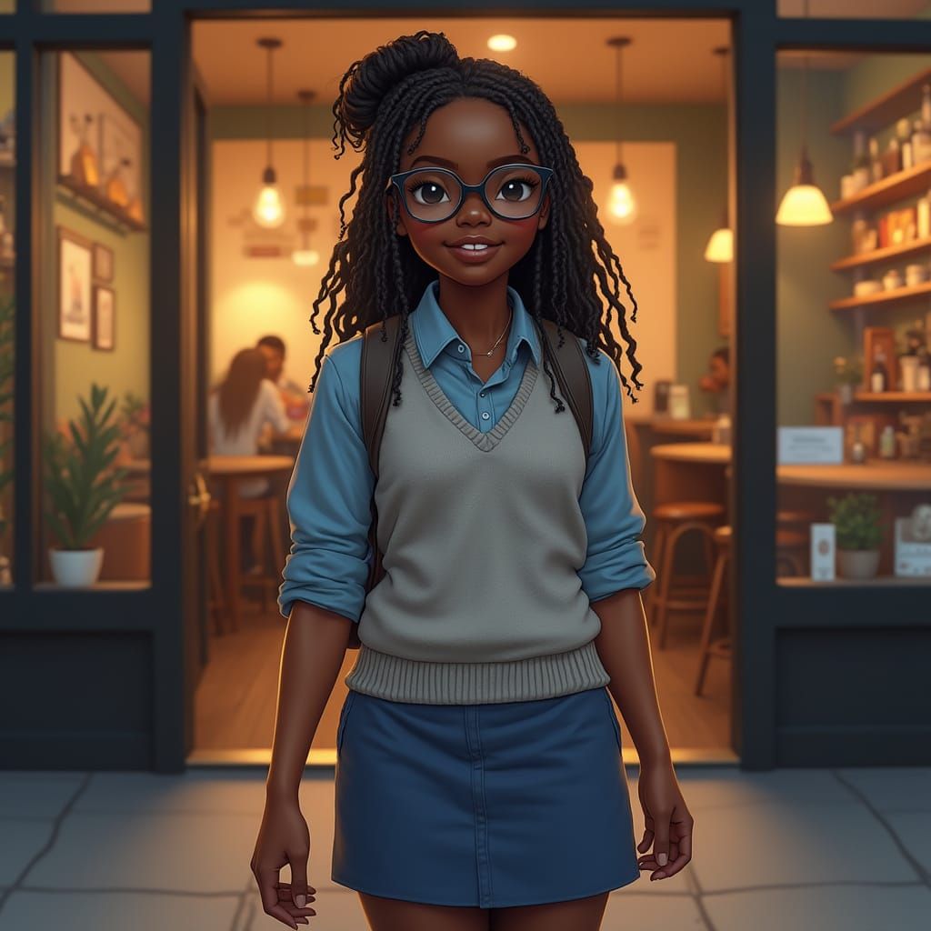 This image shows a pretty African American teen with braided black hair leaving a coffee shop. She wears a gray sweater vest over a blue shirt and skirt, illuminated by warm golden light. The portrait features hyper-realistic textures.