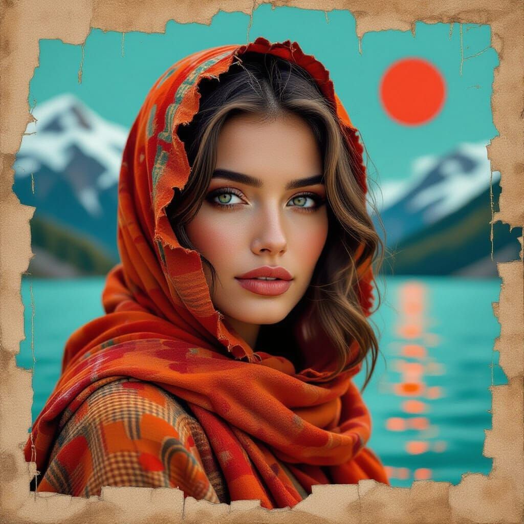 A striking picture of a woman gazing intensely at the viewer. The artwork features a collage style with cubist elements, set against a blurred, textured background with a melting sun, reminiscent of vintage art.