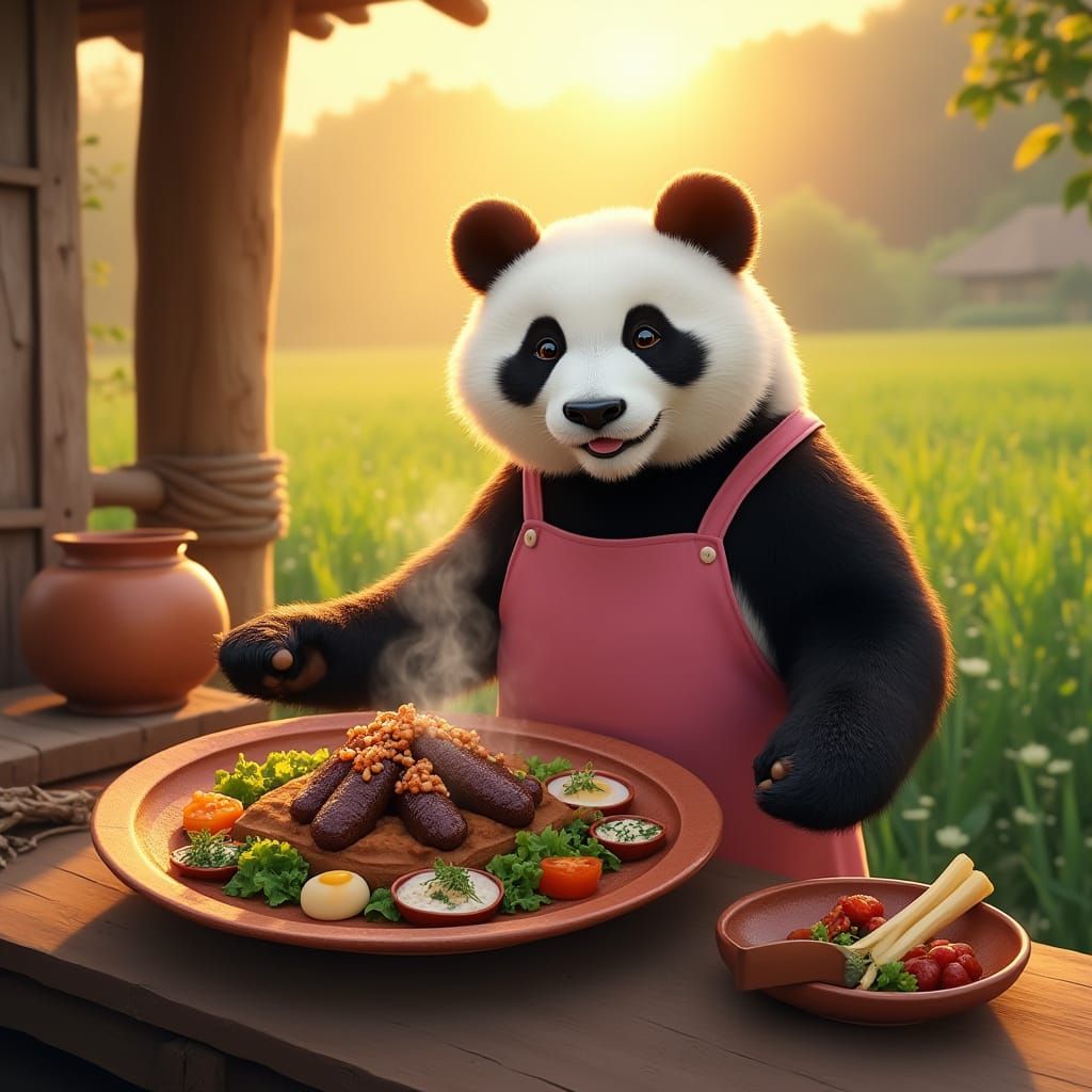 This charming image depicts a panda chef proudly presenting a beautifully plated eggplant and tofu dish in a rustic outdoor village kitchen, surrounded by lush green fields and warm golden light.