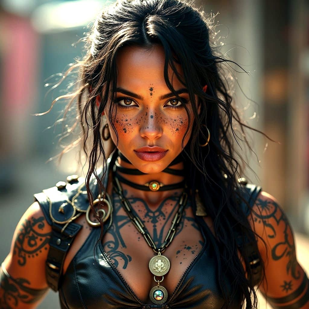 A photorealistic 8k image capturing a determined Mexican woman in combat gear, adorned with medals and tribal tattoos. Features dramatic lighting and a vibrant, graffiti-inspired background.