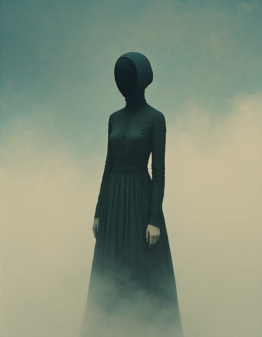 This fine art photography captures an avant-garde fashion portrait with faded pastel colours, a foggy atmosphere, and unique artistic elements. The image includes full-body portraits, group shots, and faceless figures in a surreal and hyperrealistic style.