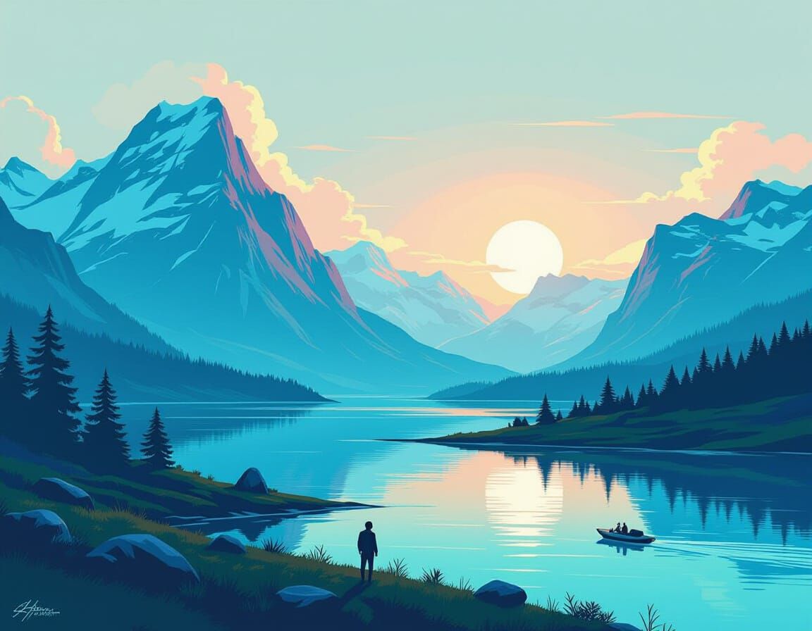 A serene natural environment showcasing a deep color gradient blending vibrant turquoise, cyan, blue, and light blue tones, rendered in a futuristic digital art style.