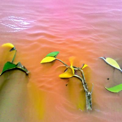 This image shows a vibrant mangrove forest with a color palette of yellow, orange, and pink, creating a warm and inviting scene.
