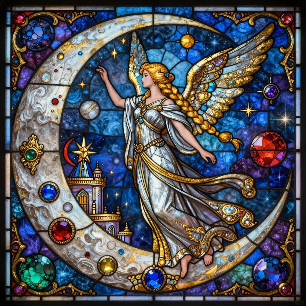 This image showcases a heavenly maiden with golden hair and ornate wings arriving at a moon kingdom made of gemstones, rendered in a vibrant, intricate stained glass aesthetic.
