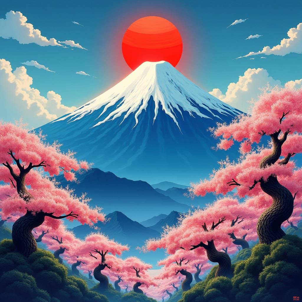 A fantastical scene of Mount Fuji in the style of Japanese Ukiyo-e art. The majestic mountain is covered in cherry blossoms under a blue sky, rendered as a detailed matte painting.