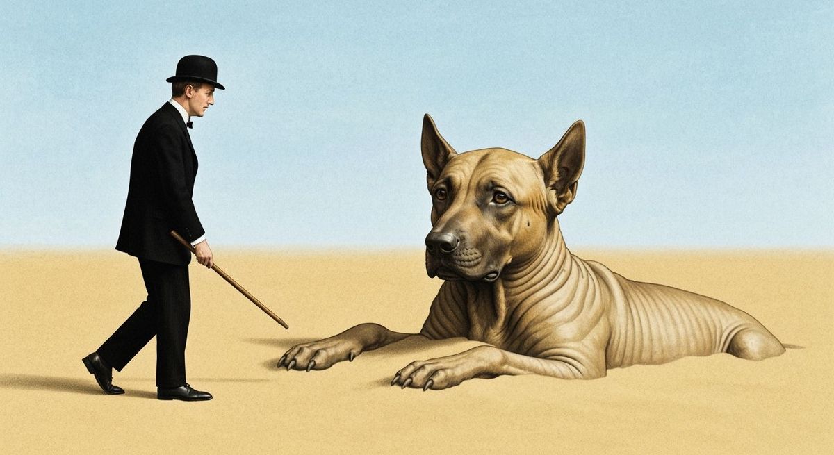 A surreal scene where a man in a suit discovers a colossal sphinx resembling a Belgian shepherd dog, half-buried in sand. Evokes a dreamlike, illustrative style.