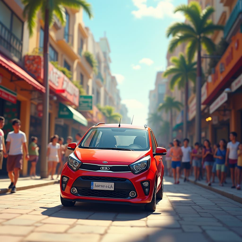 This image shows a vibrant red Kia Picanto parked on a busy city street filled with shops and people. Rendered in a stylized digital painting, it captures a cheerful, energetic atmosphere.