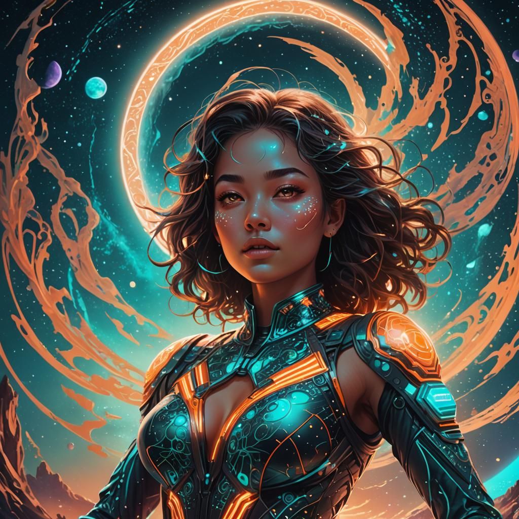 Surreal Concept Art. Close-up portrait. A female figure wearing a neon-colored outfit dives into a shining full moon. Highly detailed digital matte painting. Vibrant colors with turquoise and orange hues, radiating starglow. Intricate, swirling cosmic patterns surround her. In the depths of space, stars shine through her neon suit. Lit by soft, lunar glowing light, epic complementary colors, 8k resolution, trending on Artstation, Unreal Engine 5, digital art, fantasy illustration, dreamlike atmosphere, intricate textures, cinematic vision, best quality, masterpiece.