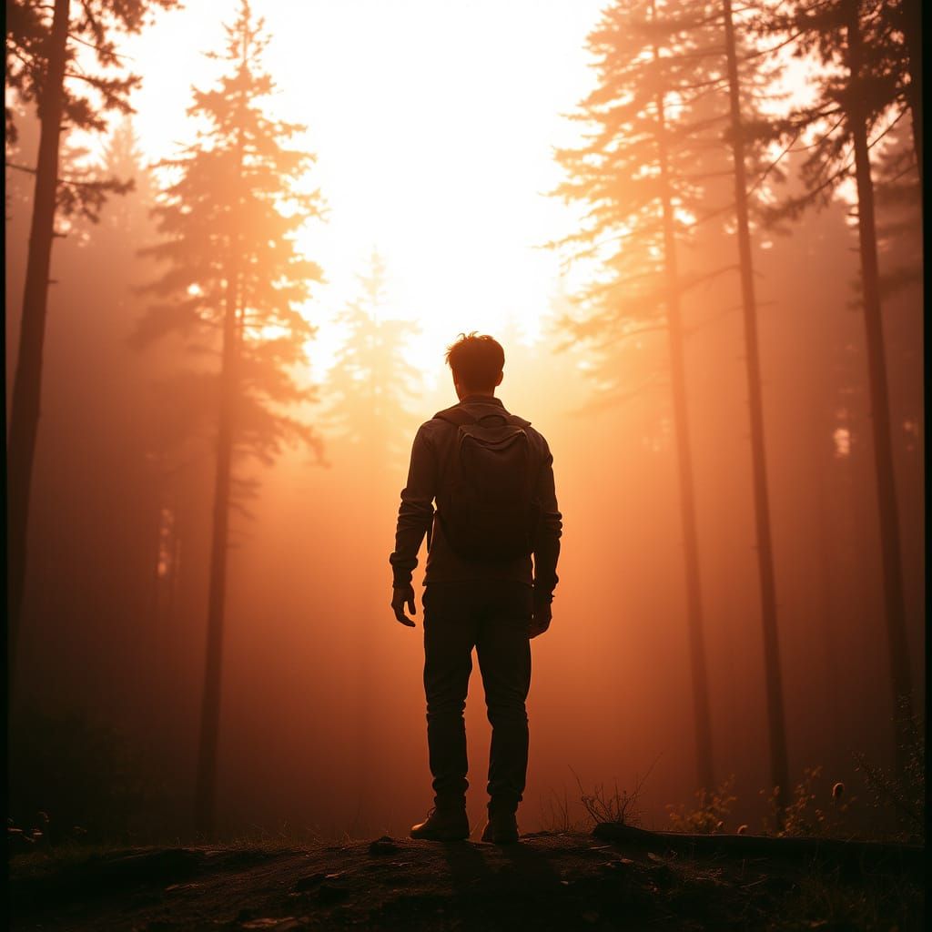 This image captures a lone figure standing at the edge of a dense forest, bathed in warm golden light as the misty dawn atmosphere clings to the landscape. The scene is rich in cinematic detail, with bold color and dramatic lighting that invites the viewer to step into the natural world.
