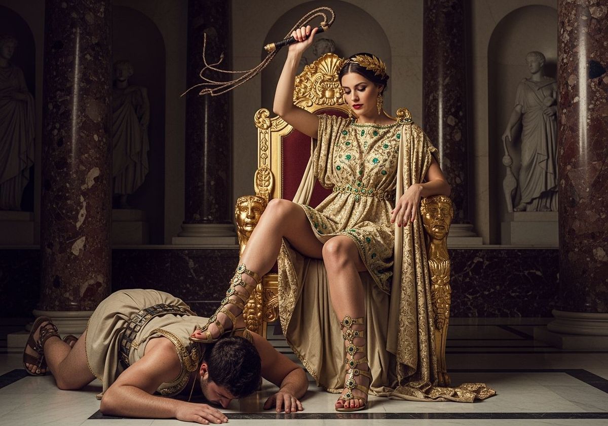 This image shows a Roman Empress seated on a throne in a palace. She is wearing a toga and wreath, and trampling a servant while holding a whip, captured with professional photography techniques.