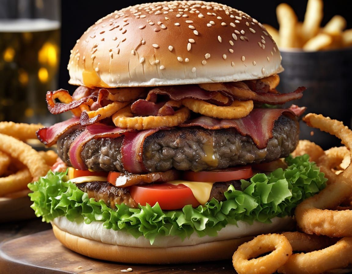 A mouth-watering photograph of a gourmet cheeseburger. The burger includes bacon, lettuce, tomato, and onion rings. It has a juicy, steamy look and is styled like a professional advertisement.