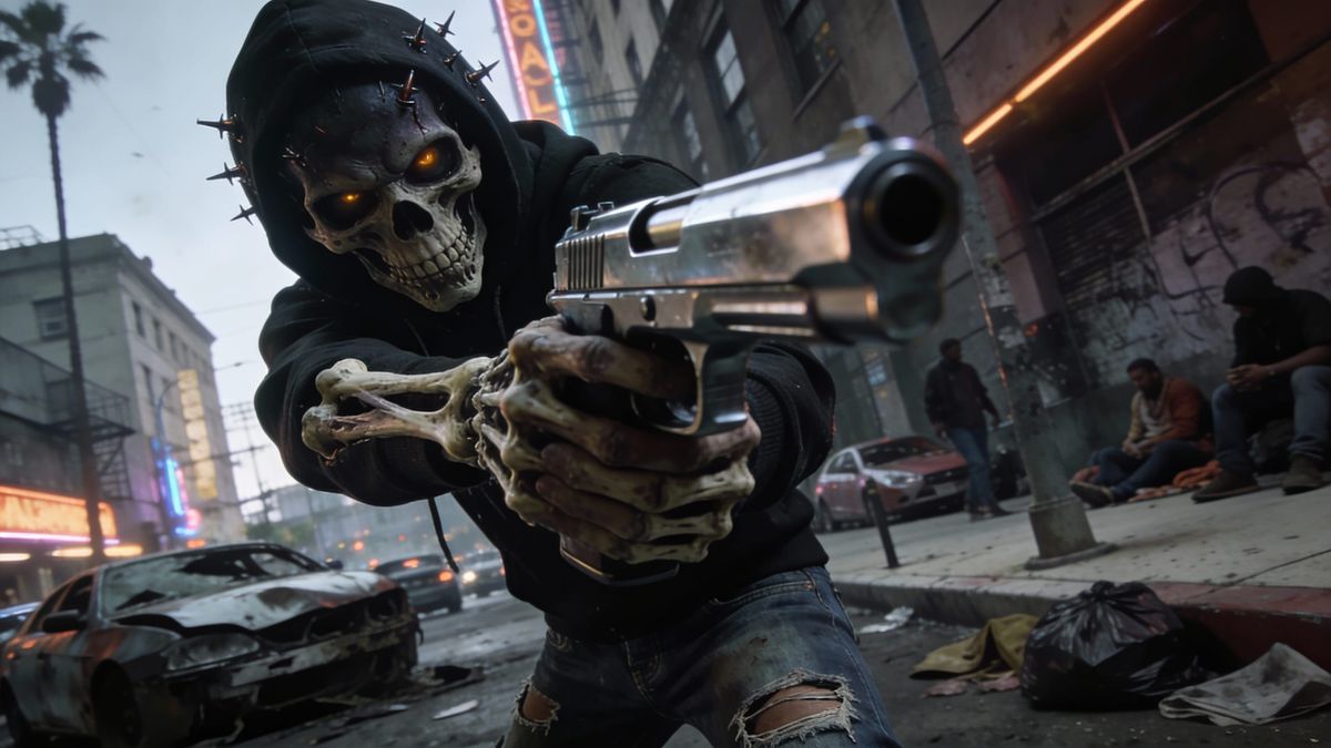 A photorealistic image depicts a terrifying skeleton in a hooded sweatshirt and ripped jeans aiming a pistol. The scene is a dark, cinematic urban street with wrecked cars.