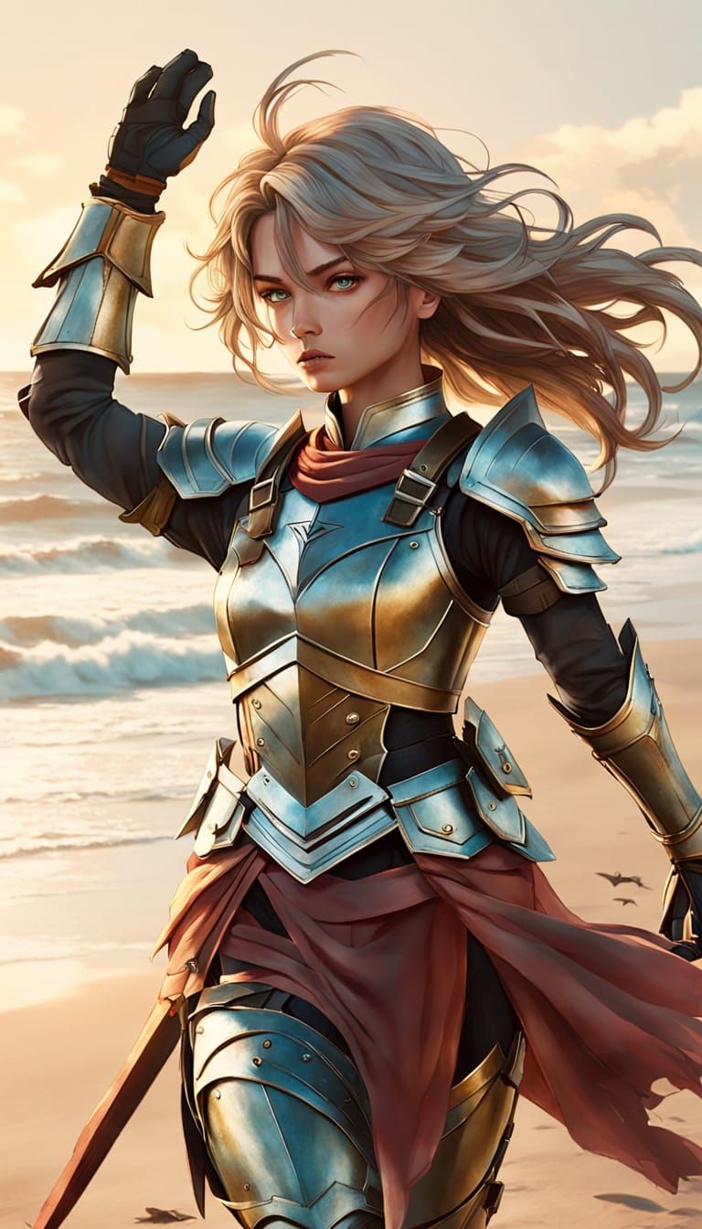 A heroic female warrior stands triumphantly on a sandy beach, bathed in warm golden light, with vibrant colors and soft focus creating a cinematic masterpiece of epic proportions.