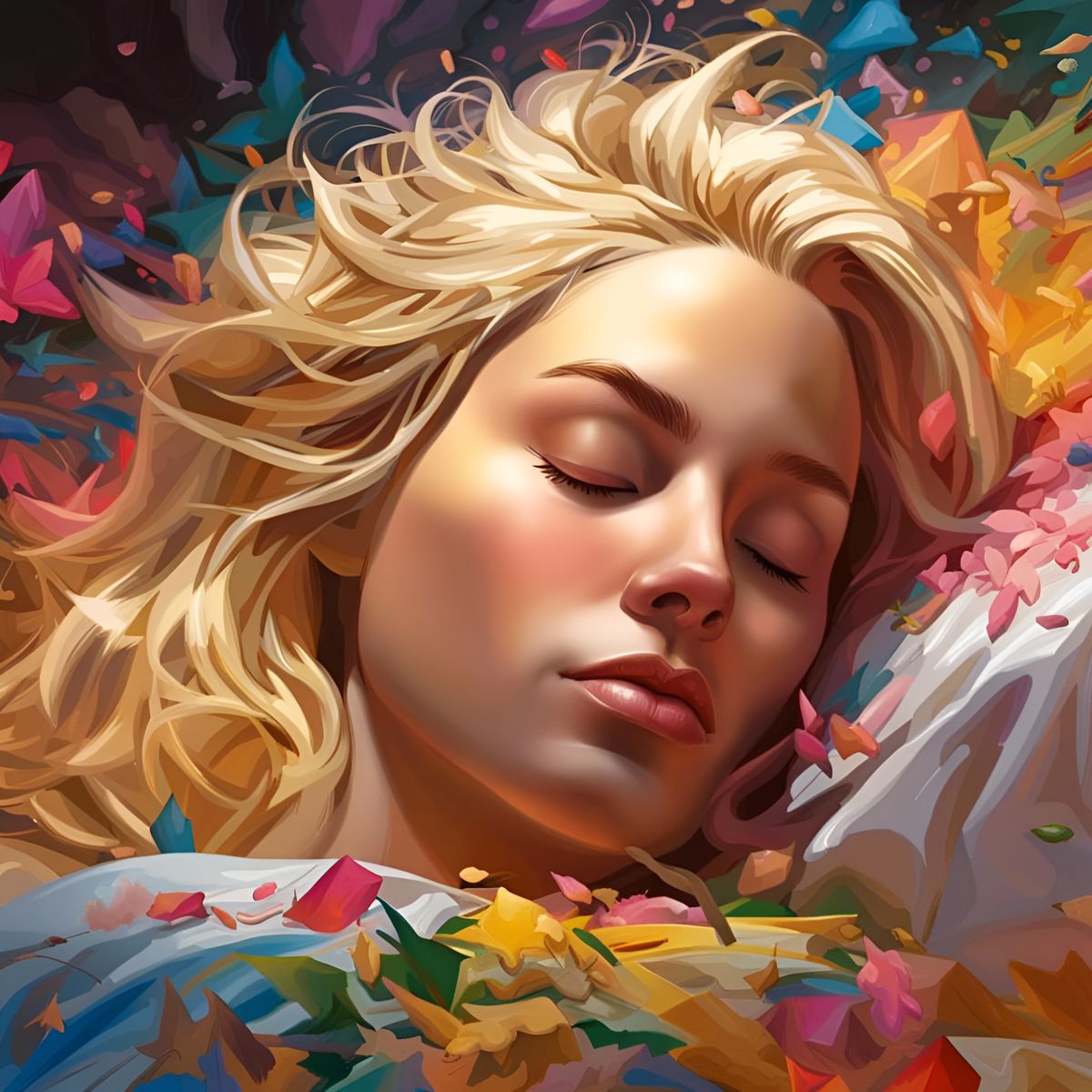 This image shows a close-up portrait of a blonde sleeping woman. The picture has dramatic side lighting and a colorful background, rendered in a hyperrealistic splash art style.