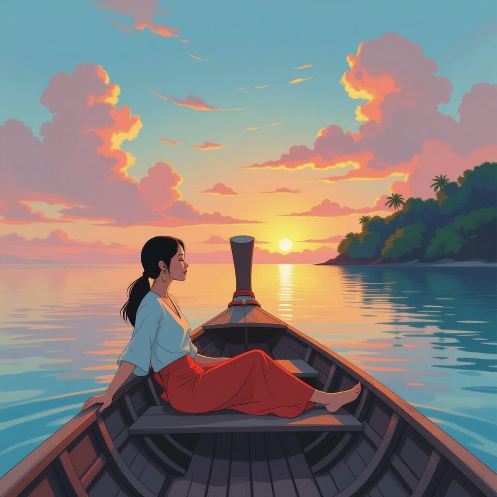 A tranquil scene of a Thai woman in a longtail boat heading to an island at dawn. The image features bold outlines and a vibrant, dreamlike color palette evoking a peaceful, magical atmosphere.