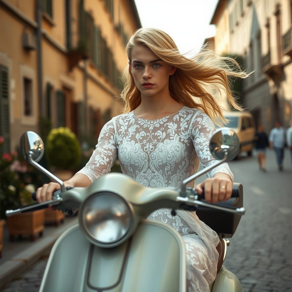 This image captures a striking scene of a young man in a wedding gown and blonde wig, riding a vintage moped through Florence. Features soft lighting and a dreamy atmosphere, like a high-fashion editorial.