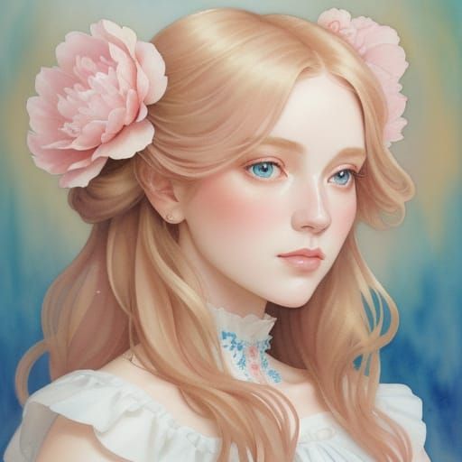This AI generated image is a concept art portrait of a beautiful girl with curly blond hair adorned with red bows, surrounded by peonies. Features delicate brushstrokes and soft, rosy lighting.