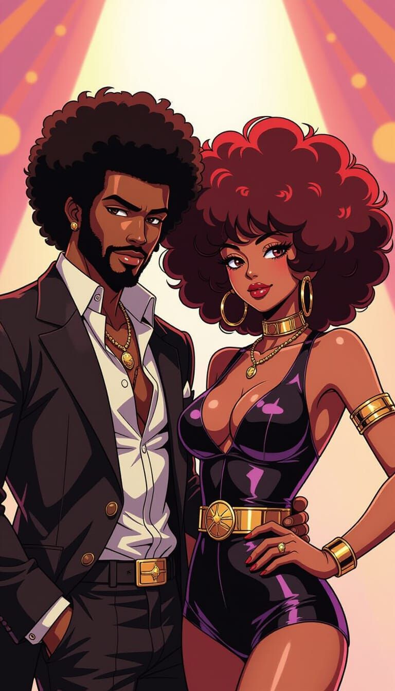 This image shows a Black band from the 1970s with male and female singers. The group is posing together with vibrant afros and stylish outfits in a cel-shaded, manga-inspired aesthetic.