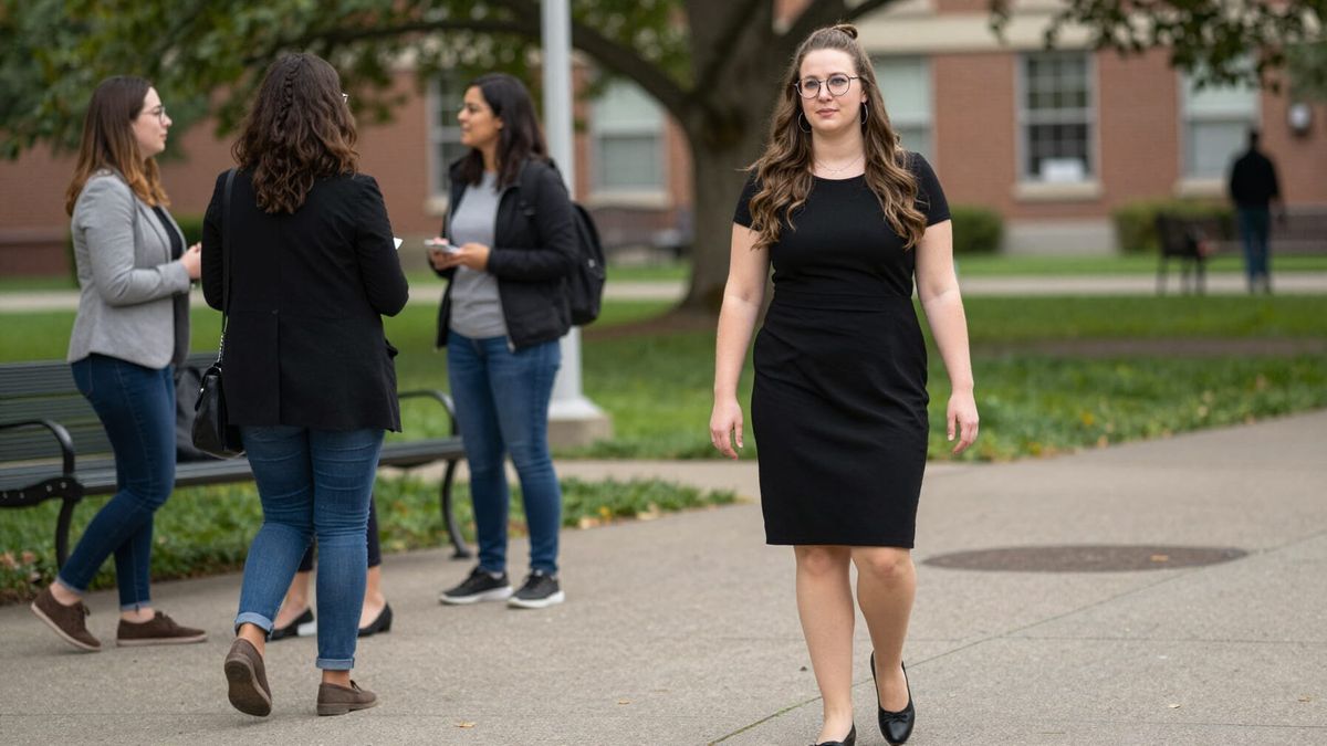 A striking image of a librarian with long wavy hair and glasses, dressed in a black dress, enjoying a night out at a park with colleagues. She is confidently flirting with a young man.