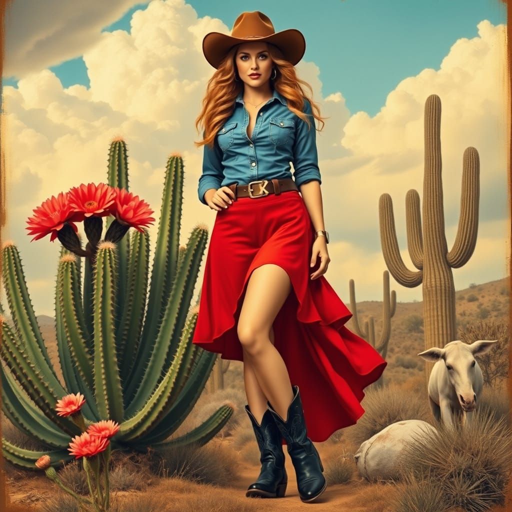 This image shows a beautiful woman in a striking red and blue outfit, surrounded by vibrant desert flowers and a majestic cloudy sky, set against a detailed and evocative Wild West backdrop.