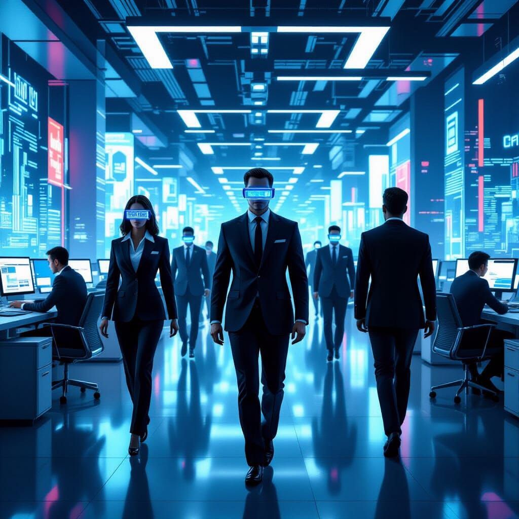 This image depicts a tense, retro-futuristic corporate office with obscured figures in sharp suits. It captures a hyperrealistic scene with neo-impressionistic brushwork, evoking motion and subtle intrigue.
