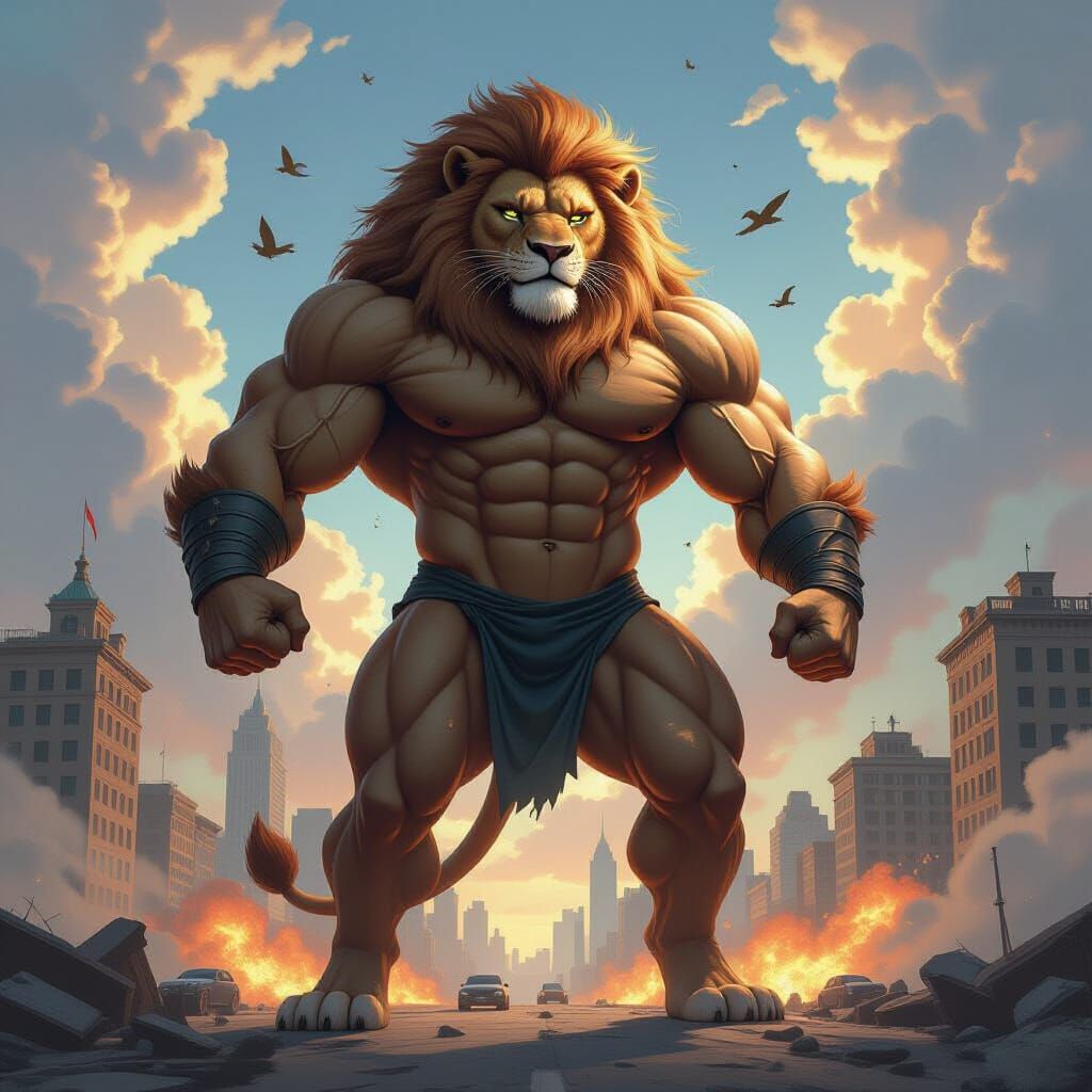 Generate your own giant muscular lion destroying cities with our free AI generator. Easy and fun!