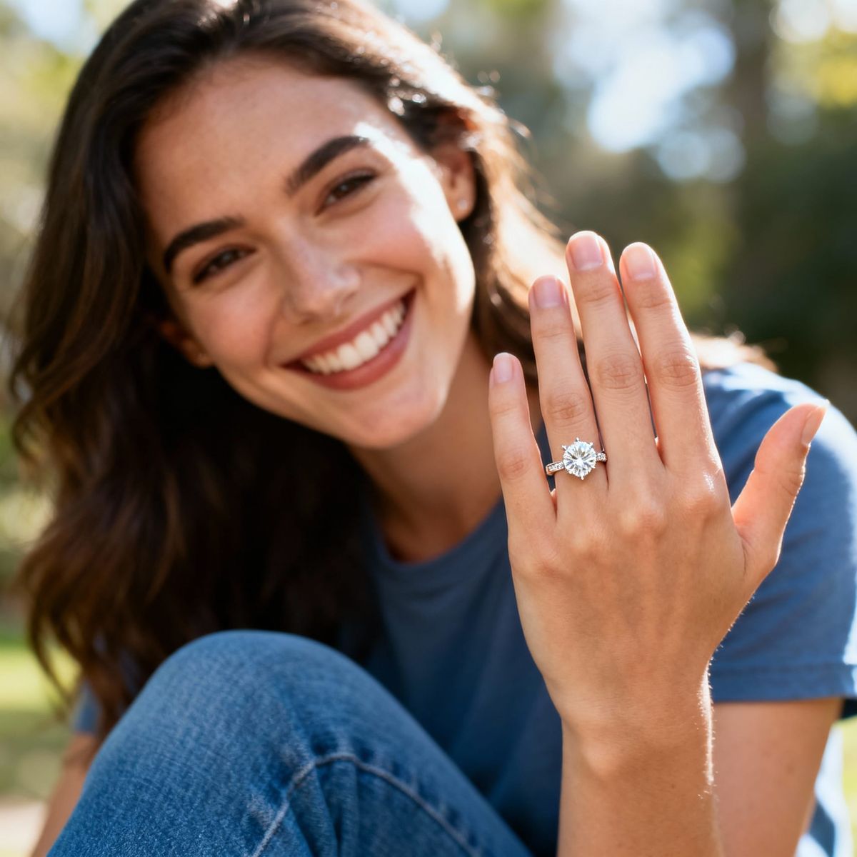 This high-resolution image captures a joyful woman in casual attire, happily displaying her large, sparkling diamond engagement ring. Cinematic lighting highlights the ring and her radiant smile.