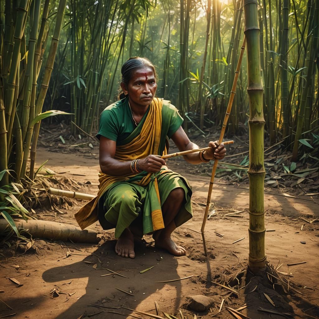This image shows a Rodiya Tribe member in Sri Lanka performing a ritual with a bamboo stick. The artwork features vibrant colors, dynamic lighting, and detailed textures in a splash art style.