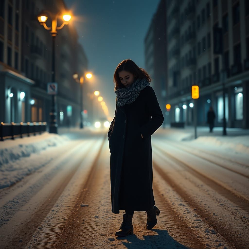 This image shows a solitary woman walking through a snow-covered city street on a winter night. Cinematic realism captures the scene's melancholic mood through dramatic lighting and textures.