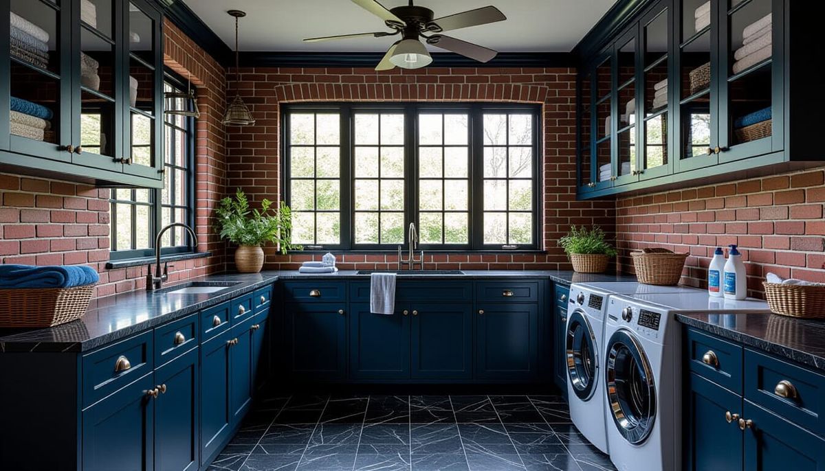 This image showcases a clean and tidy Victorian laundry room featuring dark blue cabinets, glass windows, and charming brick wallpaper. The wide-angle view highlights the organised space with modern appliances.
