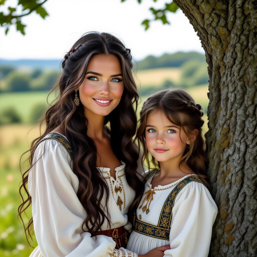 This image depicts a medieval woman with long, curly black hair and blue eyes, along with an 8-year-old girl, in a serene rural setting. Both are wearing white medieval dresses adorned with Celtic symbols, reminiscent of classical paintings.