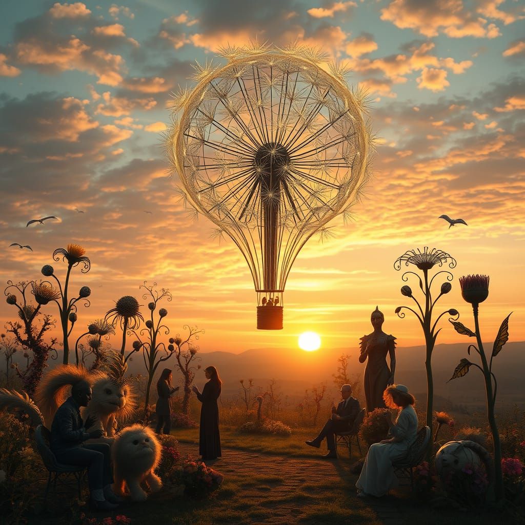 A glowing, dandelion-shaped hot air balloon floats on the horizon at sunset. This image blends bio-art with surrealist and transhumanist elements, rendered in 8k resolution.