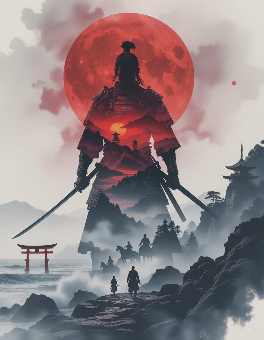 This image shows a samurai warrior's silhouette with a battle scene revealed inside. Features include mist, a blood moon, ocean waves, and a temple, in a surreal painterly digital style.