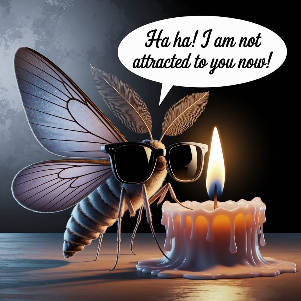 A whimsical image shows a moth wearing sunglasses next to a lit candle. A word bubble expresses the moth's disinterest in the flame. The art style is highly detailed and realistic.
