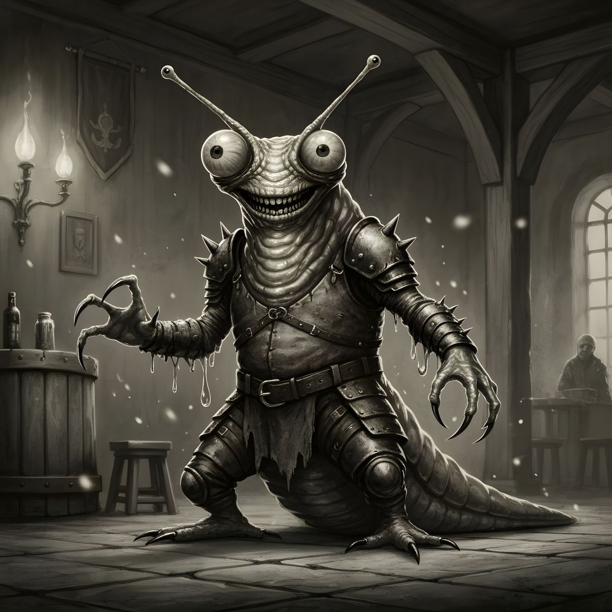 A terrifying slug-human hybrid with bulging eyes and sharp claws grins menacingly in a dimly lit fantasy tavern. This sinister creature is depicted in a dark, surreal charcoal art style.