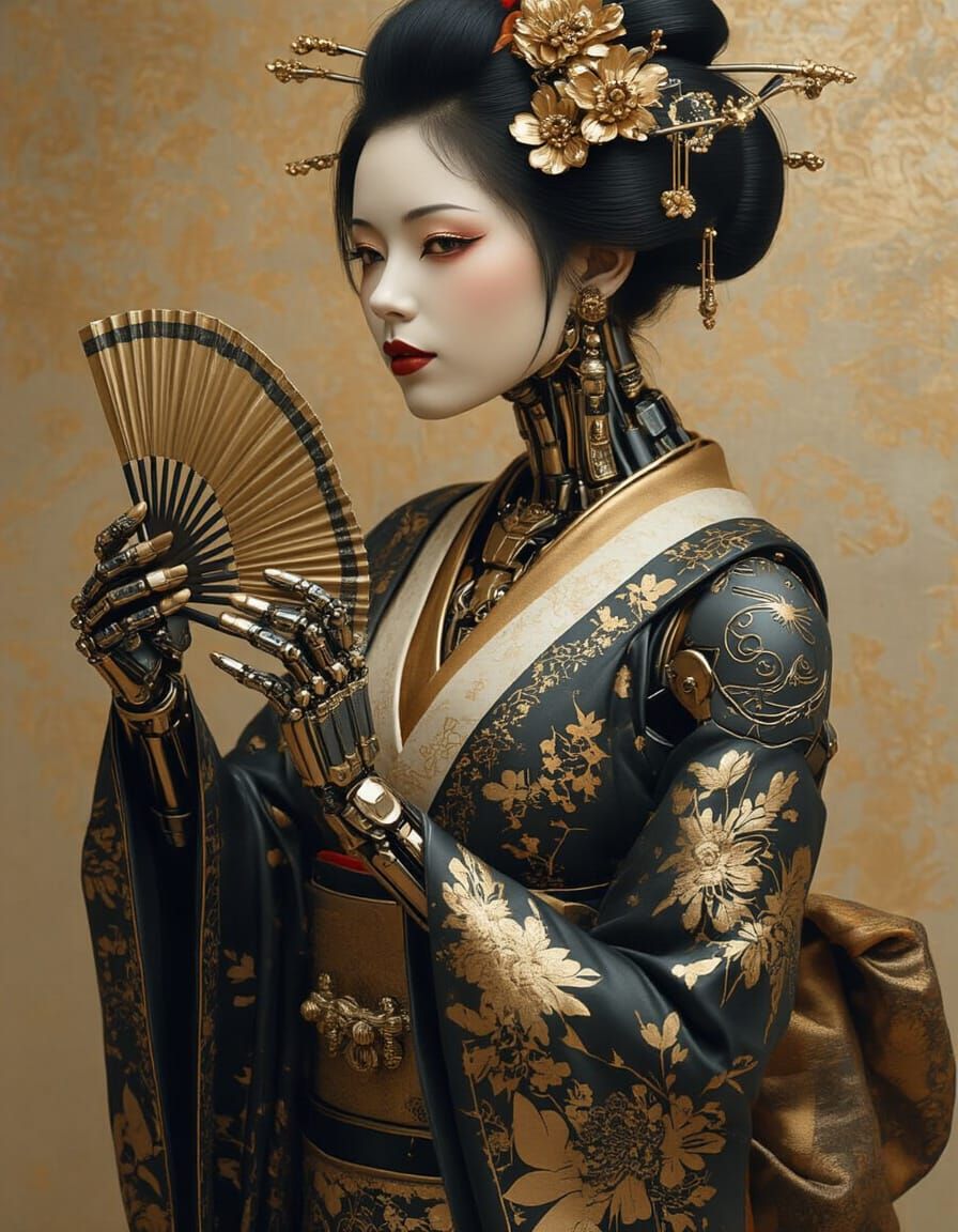 This image shows a cyborg geisha in a graceful pose, performing a fan dance. The figure features intricate metal body plating with black and gold floral etchings, and silk and chiffon garments, rendered with industrial chic and futuristic detailing.